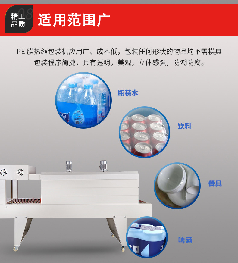 - 廣泛的產品適用性:能夠適應各種形狀、大小和材質的產品包裝。無論是小型的文具、首飾,還是大型的家具、工業設備等,都可以使用 PE 熱收縮包裝機進行包裝。對于不同尺寸的產品,只需調整輸送帶的速度和加熱時間等參數即可。同時,它也可以與多種包裝材料兼容,只要是 PE 薄膜,無論其厚度、韌性等特性如何,都能通過適當的參數調整實現良好的包裝效果。
