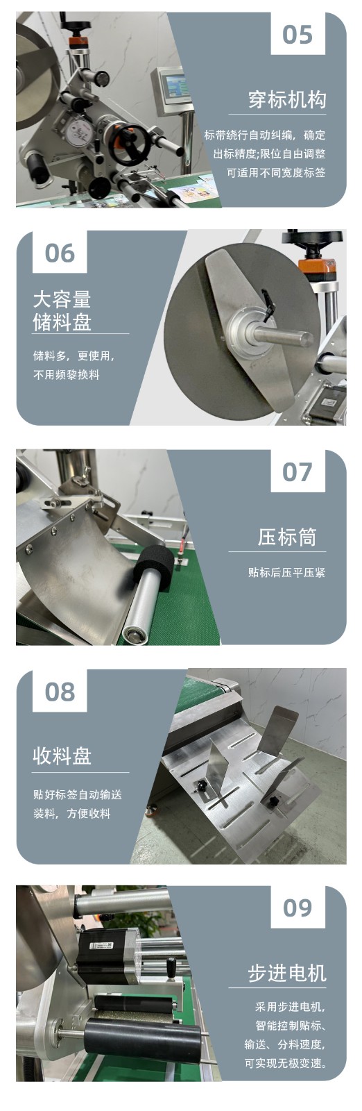 貼標(biāo)精度高:采用細分步進電機或伺服電機驅(qū)動送標(biāo),搭配標(biāo)帶繞行糾偏機構(gòu)和偏心輪牽引機構(gòu),確保出標(biāo)精準(zhǔn),貼標(biāo)精度可達 ±1mm。