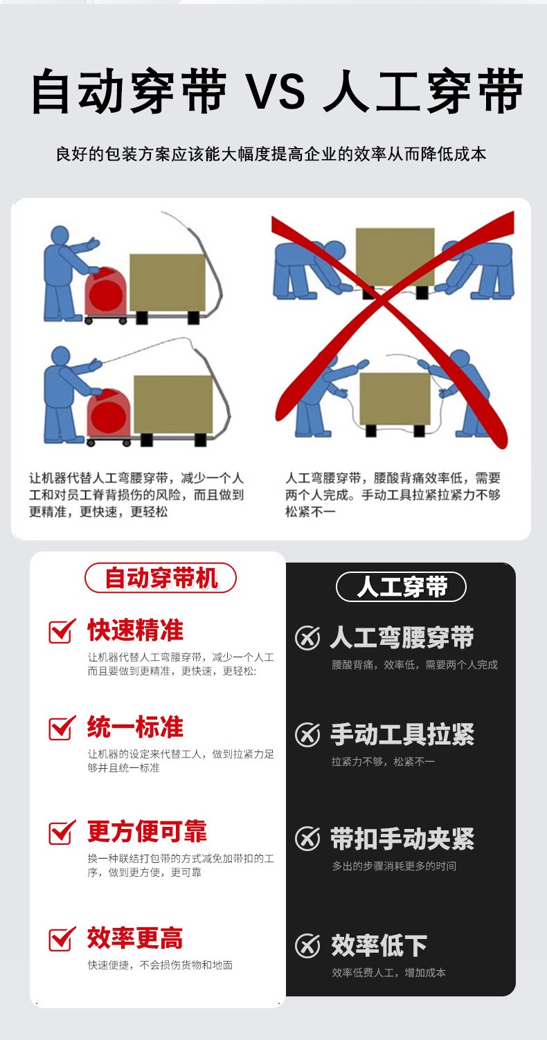 - 提高效率:相比人工穿帶,穿帶機可以大大加快穿帶的速度。尤其是在批量包裝的情況下,它可以在短時間內(nèi)完成大量的穿帶任務(wù)。例如,在一個繁忙的物流倉庫,穿帶機每小時可以完成數(shù)百個包裹的穿帶工作,而人工穿帶可能只能完成幾十個。