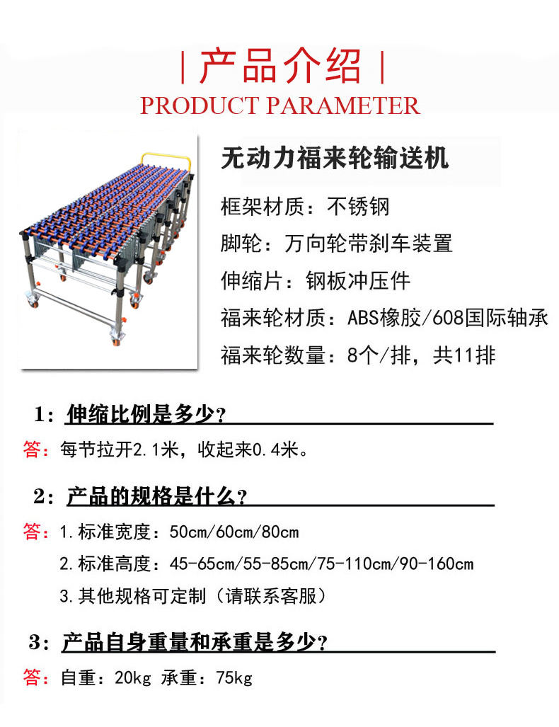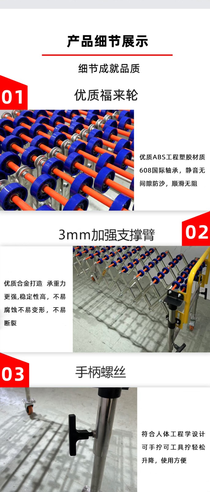 - 在無動力滾輪輸送機中,當(dāng)物品放置在滾輪上時,利用物品自身的重力在傾斜的輸送機上產(chǎn)生下滑分力,或者通過人工施加外力,使物品與滾輪之間產(chǎn)生相對運動。由于滾輪可以自由旋轉(zhuǎn),物品就在滾輪的滾動下向前移動。