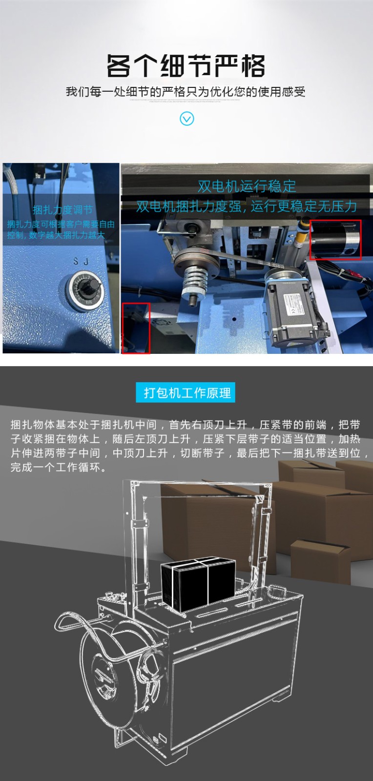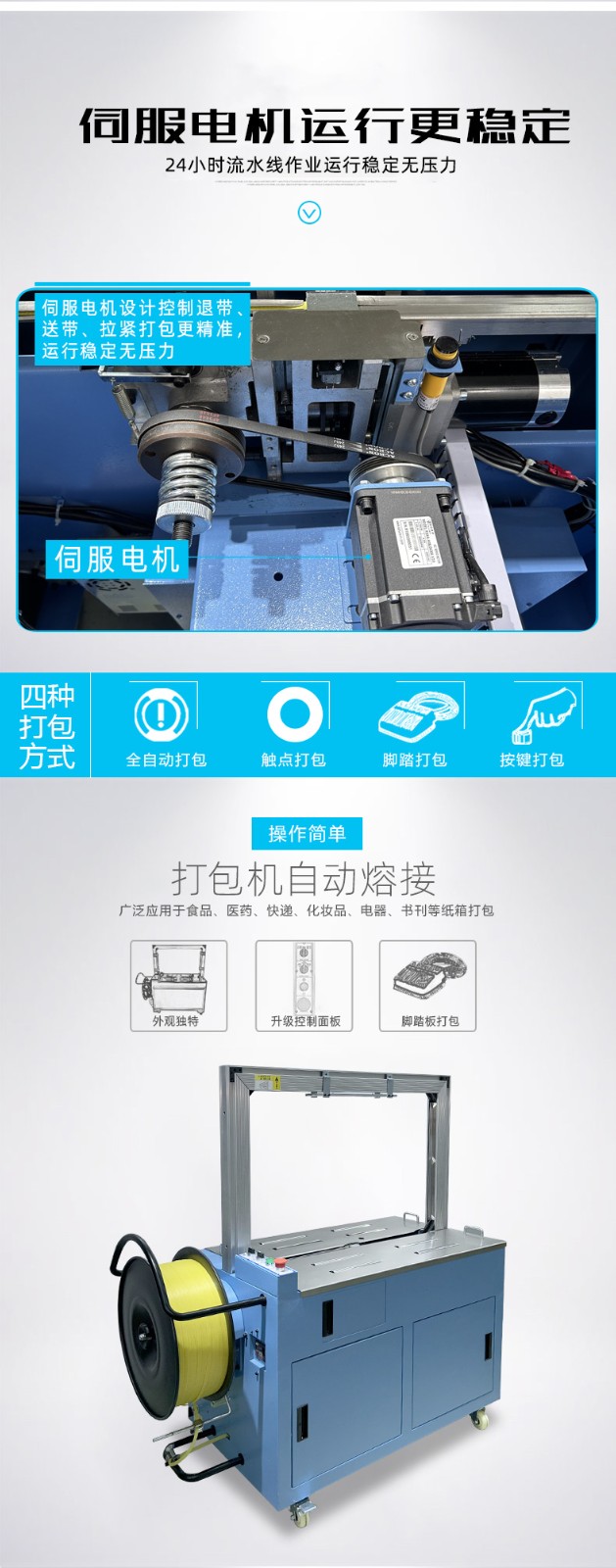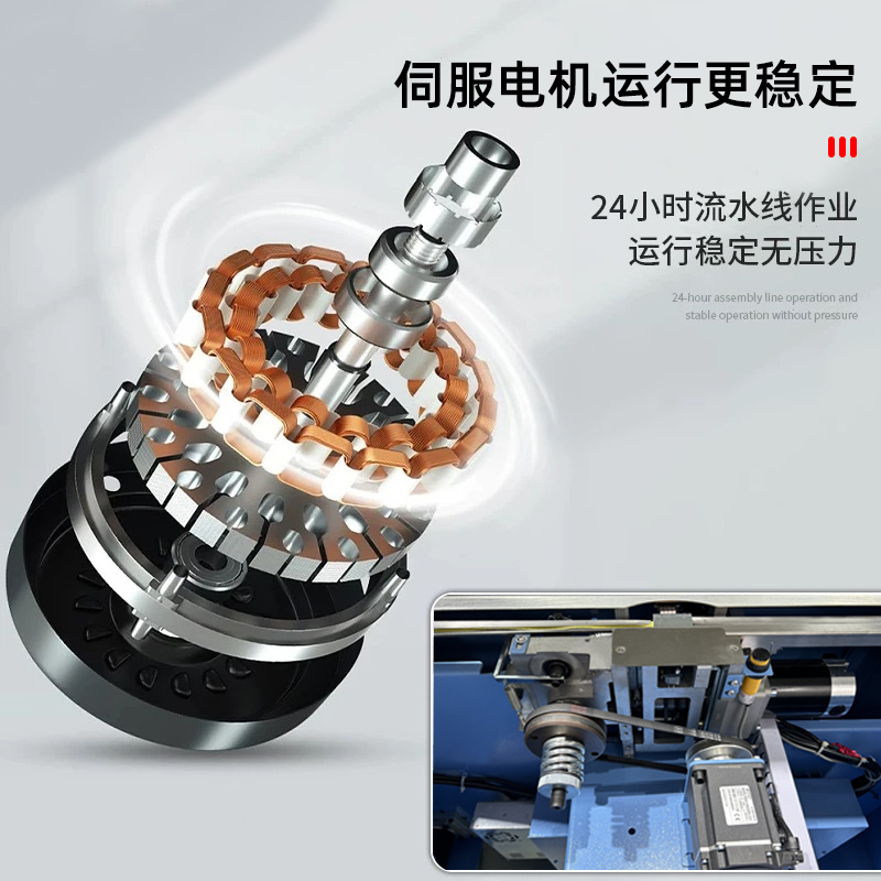 - 捆扎打包:根據(jù)預(yù)設(shè)的參數(shù),伺服電機(jī)驅(qū)動打包帶圍繞物品進(jìn)行捆扎。在捆扎過程中,伺服電機(jī)精確控制打包帶的張力,確保打包帶能夠緊密地貼合在物品表面,同時又不會對物品造成損壞。完成捆扎后,切斷機(jī)構(gòu)會自動將打包帶切斷,并對末端進(jìn)行熱封或其他方式的處理,防止打包帶松開。
